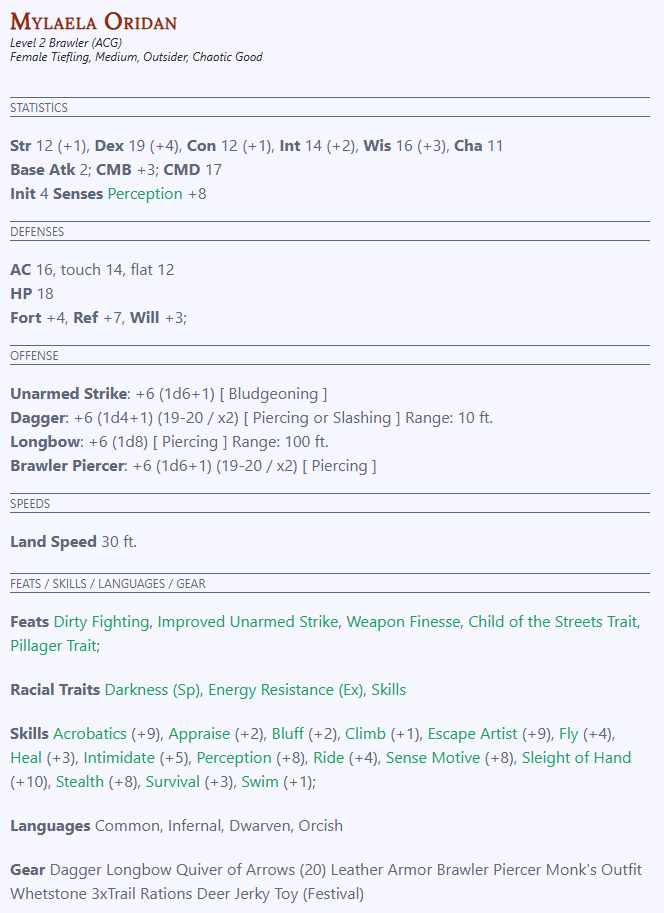 View your full character sheet online — vitals, attributes, defenses, attacks, gear, feats, spells, and more. Every D20 roll is clickable for instant results.
